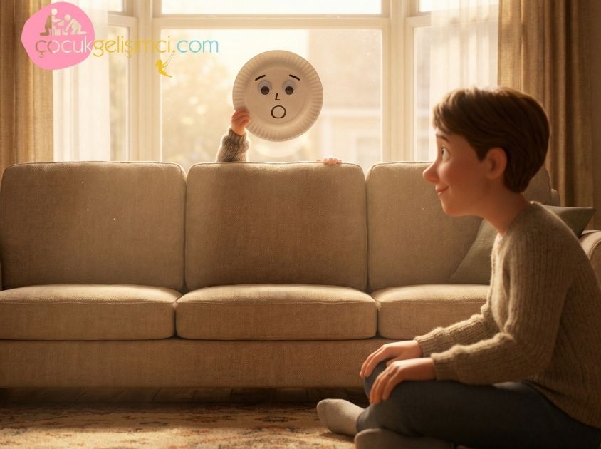 Şimdi koltuğun arkasına saklanıp "Sahne Arkası" oyunu oynuyoruz. Sırayla bir maskeyi yukarı kaldırıyoruz ve yüzümüz görünmeden, sadece sesimizi kullanarak o maskeye uygun bir ses çıkarıyoruz (Örneğin şaşkın maske için "Aaaa!", mutlu maske için "Hah hah ha!"). Diğer kişi bu sesin hangi duyguya ait olduğunu tahmin etmeye çalışıyor. Sonrasında aynanın karşısına geçip maskeyi indiriyor ve kendi yüzümüzle aynı ifadeyi taklit ediyoruz.