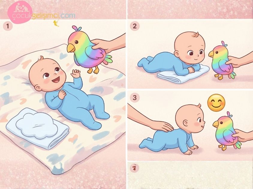 Ardından bebeğinizi yavaşça yüzüstü pozisyona getirin. Göğüs kısmının altına ince yastığı destek olarak koyabilirsiniz. Renkli oyuncağı tam karşısına yerleştirip sesler çıkararak oyuncağı hareket ettirin. Oyuncağı görmek için başını yukarı kaldırdığında ona sevgiyle dokunun ve başarısını gülümseyerek kutlayın.