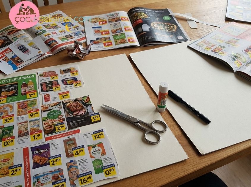 Malzemeler: Market broşürleri veya dergiler, makas, yapıştırıcı, iki adet büyük kağıt (veya karton), kalem.
