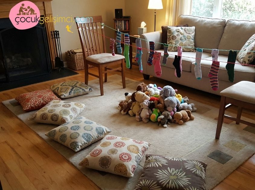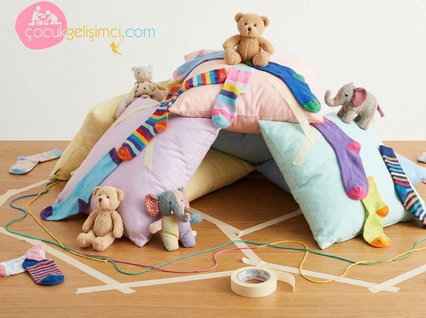 Malzemeler: Yastıklar, pelüş oyuncaklar, renkli çoraplar, maskeleme bandı veya ip.